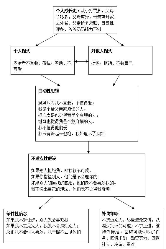 案例分析:童年時(shí)父母離異,母親離開家,孩子感受到被重要的人“拋棄”,爺爺奶奶年事已高,只能負(fù)責(zé)生活,父親忙于自己的生意和自己的新家庭,也無暇顧及孩子,媽媽也只是假期偶爾和孩子一起生活,孩子長(zhǎng)期處于被忽略的狀態(tài),核心想法是:“我的父母都不喜歡我,別人怎么會(huì)喜歡我呢?”,因而總是回避和他人交流;他的想法是:“一旦人們認(rèn)識(shí)我,他們就會(huì)發(fā)現(xiàn)我很差勁”,所以孩子總是害怕麻煩別人,不想去打擾別人的生活;(包括不敢去打擾父母的生活,不好意思去打擾表哥表嫂的生活);認(rèn)為自己沒有價(jià)值,主動(dòng)與他人分離,自尊低、容易感到羞愧、對(duì)于別人的批評(píng)感到極度的焦慮,因些與他人盡量避免交流,以減少批評(píng)的可能;在生活中使用回避策略,不求上進(jìn),維持低標(biāo)準(zhǔn);回避可能失敗的任務(wù);避免高難度的任務(wù);回避求助,回避勤奮努力;回避社交、友誼、責(zé)難;表現(xiàn)出回避型人格特質(zhì);
