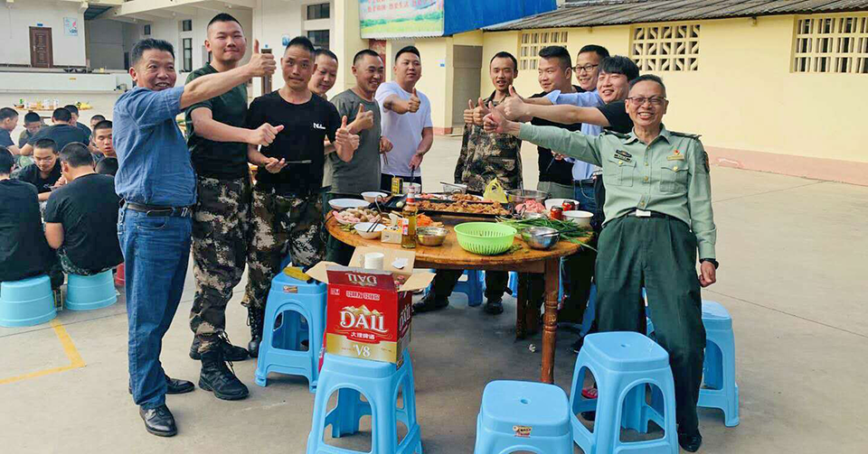 燒烤前期,由學(xué)校手藝精湛的劉大全廚師帶領(lǐng)教師組和教官組的幾名人員負(fù)責(zé)食材的清洗、腌制、裝盤(pán)、擺放,燒烤工具的準(zhǔn)備工作。由教官組擺放桌椅、安置燒烤架,安排師生就坐等部署工作。